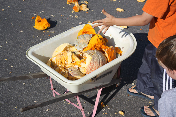 smash all their leftover Halloween pumpkins the day after Thanksgiving in the street?? We do. What little kid wouldn't want to hammer away at a pumpkin until they busted it open and the proceed to smash them all over the road? I would. After Kev finished putting up our outdoor Christmas lights and went inside for a break I told the kids to each get a pumpkin and hammer and go at it. They didn't believe me at first but I said quick before daddy comes back out (I'm the fun parent can you tell?). They had a blast until every single bit of pumpkin was smashed and the street was covered with guts and seeds. We then did the responsible thing of cleaning up (you didn't think I was gonna just let them leave it like that did you, Kev would surely kill me). They loaded up their wheelbarrel and dumped it into Miles' garden for compost and besides a few seeds you would never know. I'm not afraid of a little mess and always want my kids to be kids while they still can.